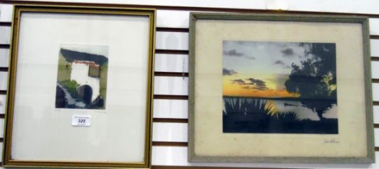 Limited edition print Continental cottage with figures, signed indistinctlySigned printSunset scene (2)