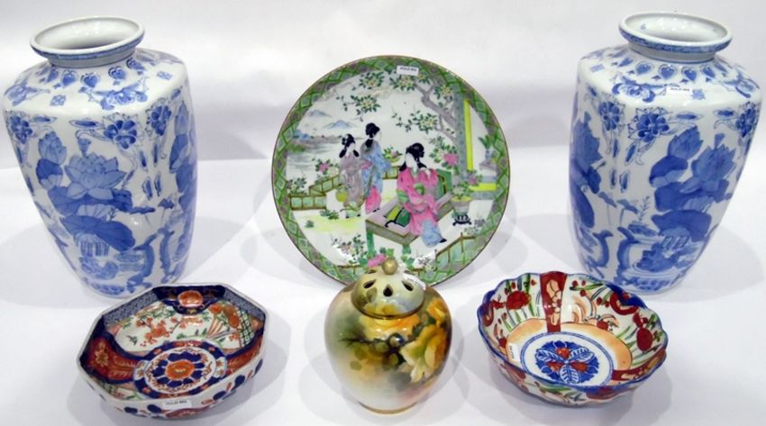 Noritake porcelain covered pot-pourri jar, shouldered and tapering, painted with yellow roses, large blue and white Oriental vases, two Imari porcelain bowls and an Oriental plate