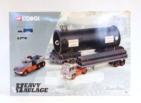 Corgi heavy haulage diecast model of Sunter Bros, Guy Invincible long platform trailer, pipe load and diamond T Ballast, Nicholas Bogies vessel load, etc. (boxed)