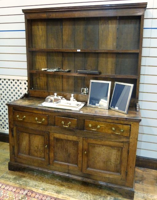 Georgian oak dresser the three tier plate rack with with moulded pediment, reeded uprights, the base with two long and one short drawer, brass swan neck handles, cupboard below, shaped bracket feet, 141cm wide