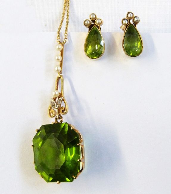 Gold, peridot, pearl and diamond pendant, the faceted shaped square green stone suspended on dropper with seedpearls and two small diamonds and a pair of peridot and seedpearl earrings to match