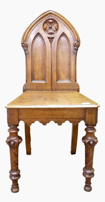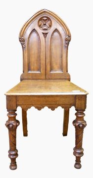 Oak hall chair with arched shaped back, on carved legs