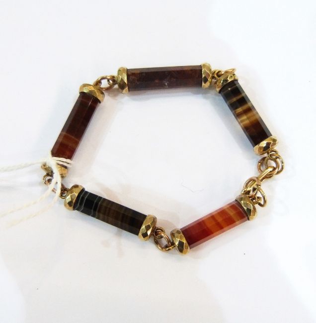 Rolled gold and agate bracelet having five cylindrical and facet-cut links