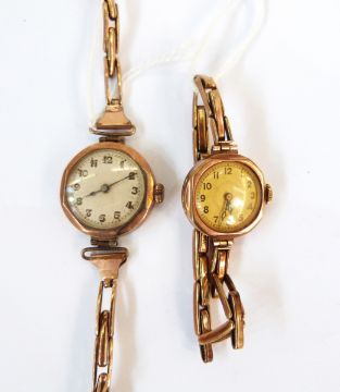Lady's 9ct cased gold wristwatch on 9ct gold strap and another with broken strap (2)
