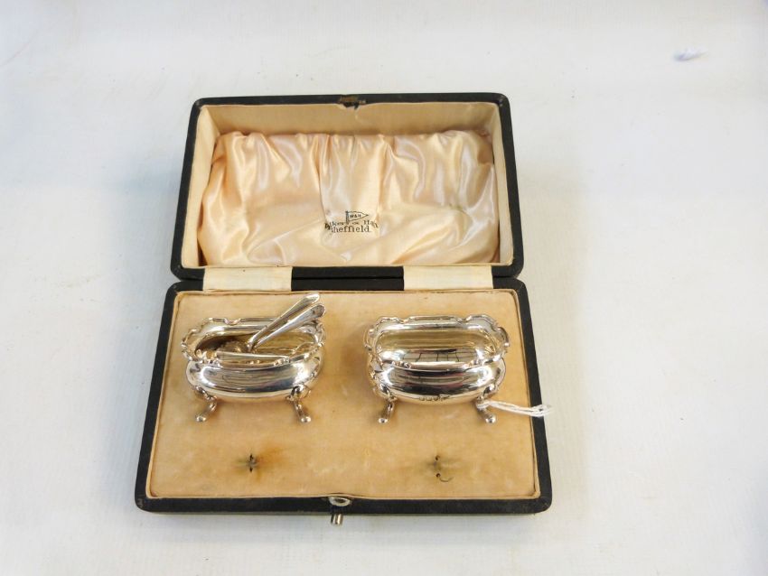 Victorian cased set of silver salts with three spoons, Sheffield 1894, makers Walker & Hall and a cased pair of silver pickle forks, Sheffield 1916, maker James Porter & Sons, in box