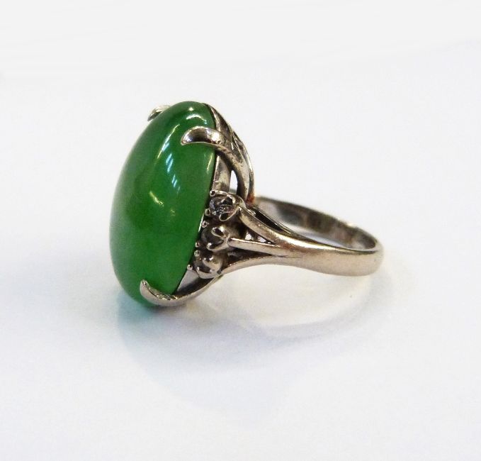 White gold-coloured metal jade & diamond ring, set oval polished jade stone, 6 small diamonds to shoulders,approx size J. 1/2