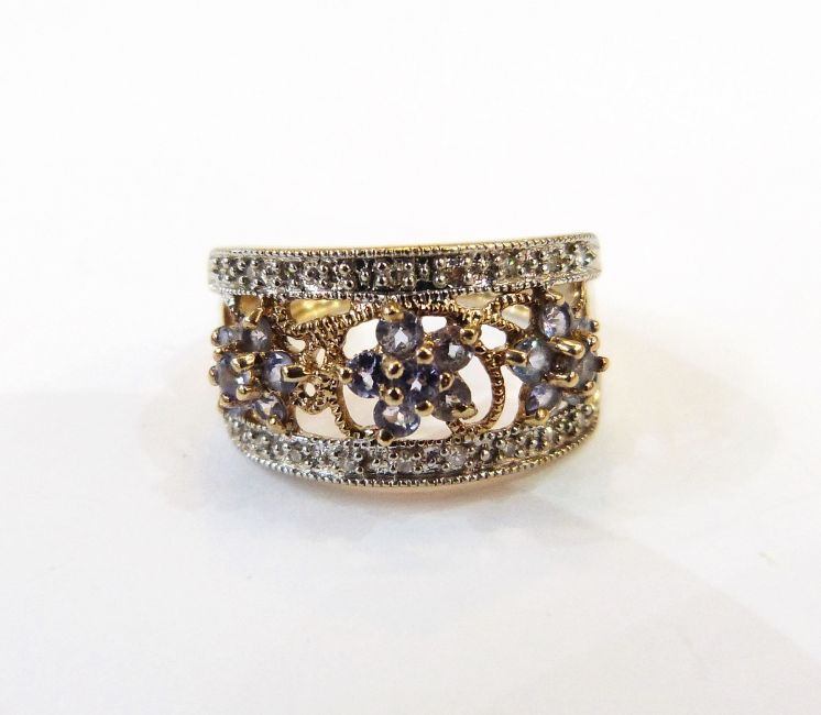 QVC 9ct gold white and purple dress ring having two white stone illusion set bands supporting central gold, trailing design with purple stone flowerheads