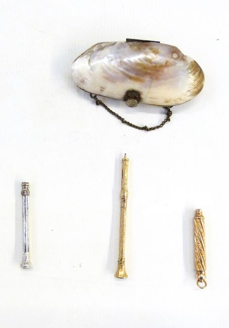 Aikin Lambert & Co gold-plated folding propelling pencil with chased and wrythen decoration, another gold-plated propelling pencil, another in silver and a shell purse