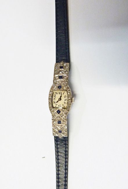 Art Deco platinum, diamond and sapphire cocktail watch with blue leather strap, six sapphires surrounded by a cluster of tiny diamonds