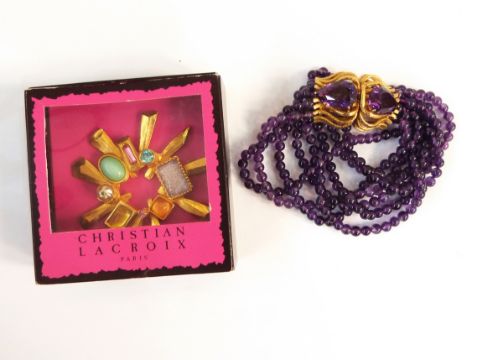 Christian Lacroix gilt metal and faux-stone brooch of geometric design and a gilt metal, amethyst and amethyst-coloured stone bracelet, probably by Elizabeth Brady, New York, with faceted stone set gilt metal basket design, double clasp and multiple strings of turned amethyst beads