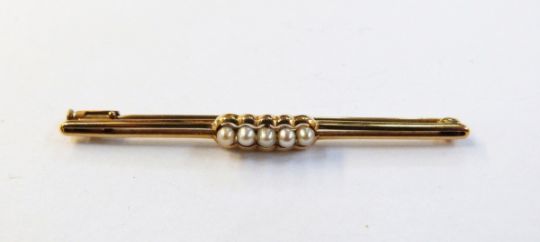 Gold-coloured metal bar brooch set with five small pearls, a 9ct gold dress ring set oval jade-coloured stone, an antique 9ct gold and turquoise ring (some stones missing) and a gold-coloured metal and amethyst set ring