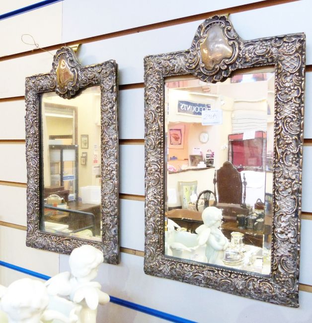 Pair of Edwardian silver photograph frames, each rectangular and with vacant shield-shaped cartouche surmounting, the frames embossed with rococo scrolls, flower heads and trelliswork, Chester 1901, 41cm x 25cm