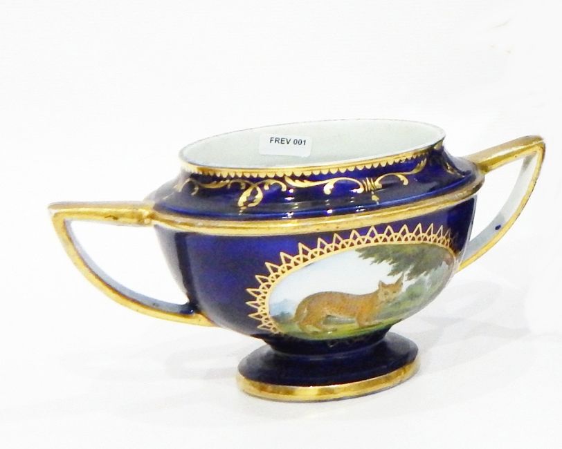 Late 18th century Coalport 'Animal' pattern two-handled urn (missing lid), with oval cartouche of fox, the blue ground with gilt decorations, an oval dish decorated with cartouche of lioness, the blue ground with gilt decoration and a circular dish decorated with exotic birds (3)