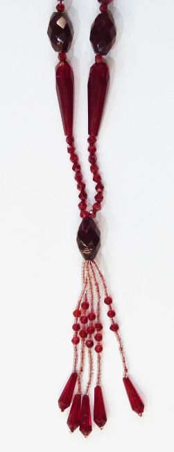 Vintage red glass bead necklace with faceted beads of varying shades of red and with central tassel