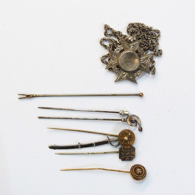 Silver medallion on chain 'B.C.C Slow Race 1886, J Adams', 10oz, a miniature silver-coloured sword and various hat pins
