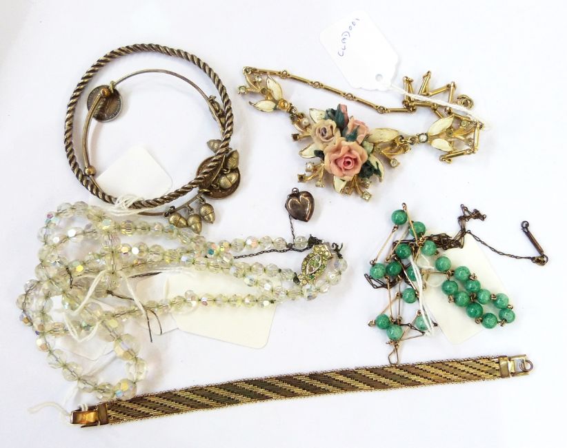 Green glass bead necklace, a bangle hung with acorn charms and sixpence, a purple paste fringe necklace, a silver plated box of circular design, the cover set with an enamel scene of a couple and various other items