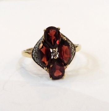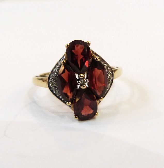 9ct gold, garnet and diamond cluster ring, the four garnets surrounded by a cluster of diamonds