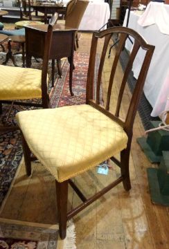 Set of six 19th Century mahogany dining chairs each with broken arch triple lathe back, padded sat on square tapering supports