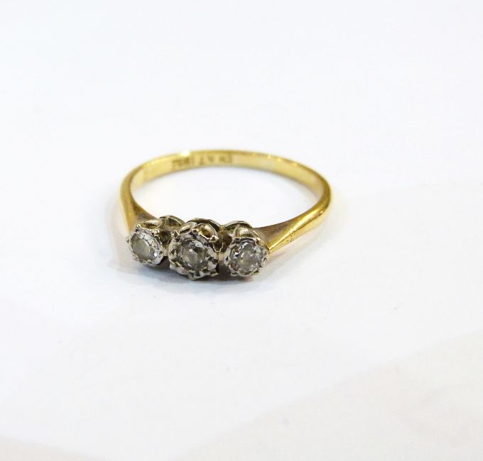 Gold-coloured three-stone diamond ring set with three Swiss cut diamonds and marked 18ct plat.