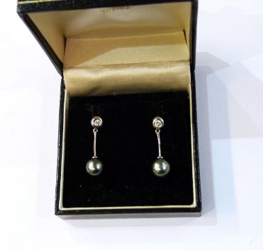 Pair of 18ct white gold, diamond and Tahitian pearl drop earrings, the pearls 8cm in diameter, 2g total