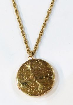9ct gold circular locket on 9ct gold chain, the locket with engraved decoration, 23.1g in total