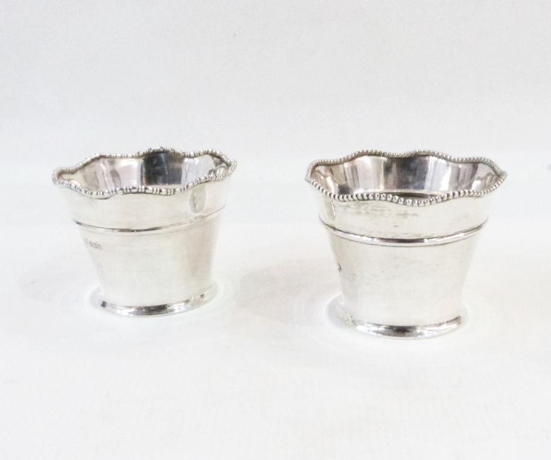 Near pair of early 20th century silver bowls with wavy beaded rim, tapered body, London 1911 and 1912, makers Harrods Stores Ltd, 3.6oz total (2)