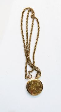 9ct gold locket of circular form with foliate decoration, on a Prince of Wales link gold-coloured chain
