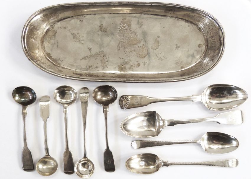 Victorian provincial silver fiddle pattern mustard spoon by Robert Williams, Exeter 1837, another by Edwin Henry Sweet, Exeter 1850 and various other Georgian and later condiment spoons, etc.