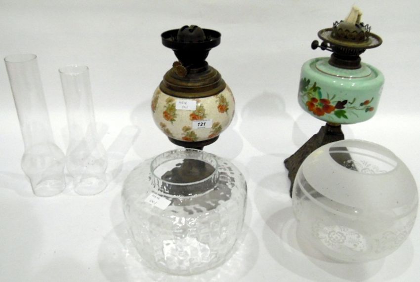 Early 20th century oil lamp with painted green opaque glass reservoir, over a tapering square metal base with dimpled clear glass shade and a second oil lamp (2)