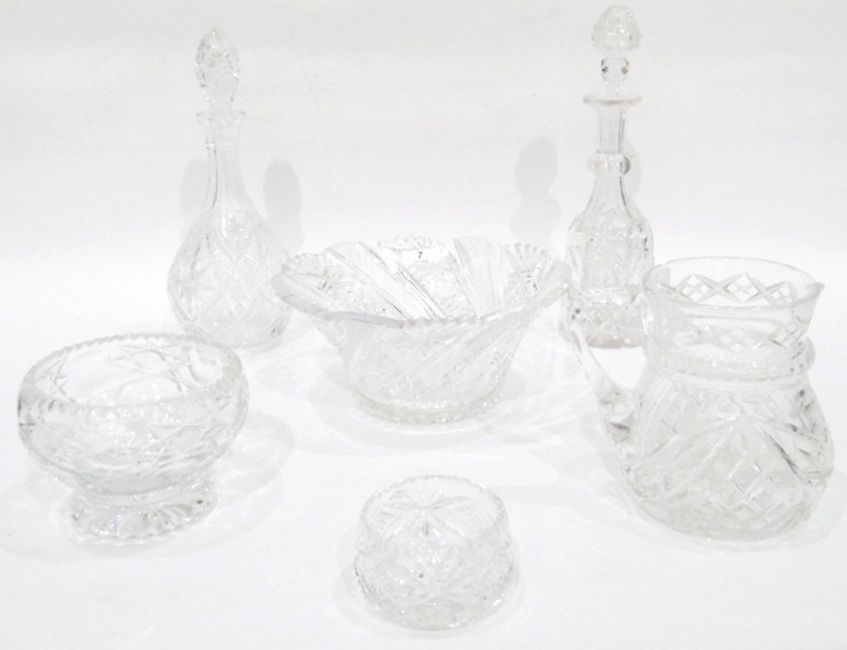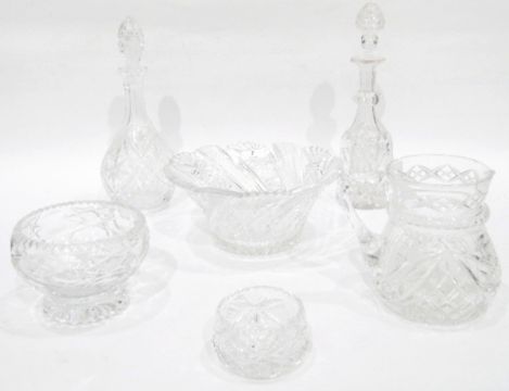 Cut glass fruit bowl, two cut glass decanters, a cut glass jug and two further bowls (6)