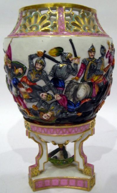 Chip to gilt rim and some of the raised figures and particularly the paintwork in places, worn gilt corners, vary nibbled internal rim to top