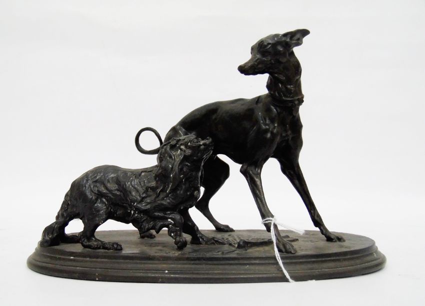 P J Mene style cast iron group of two dogs, a whippet and a spaniel, the oval base fan decorated, 24cm wide