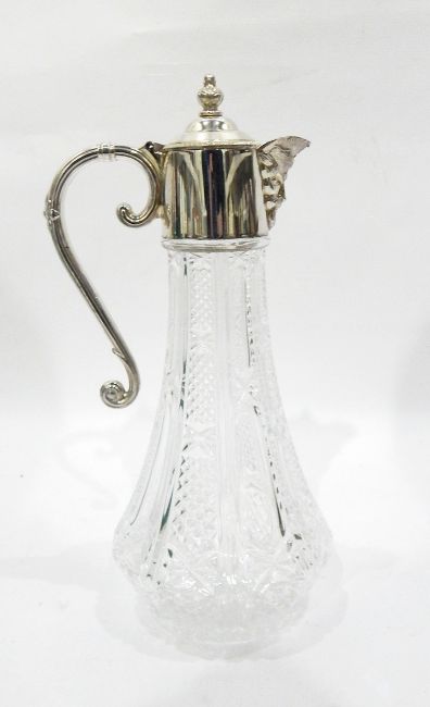 Silver plated mounted and glass claret jug with a mask decorated spout, scroll handle, 28cm high