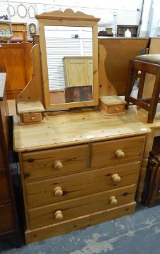 Pine dressing chest, the swing toilet mirror flanked by two small drawers, over two short and two long drawers, on plinth base, 87cm wide