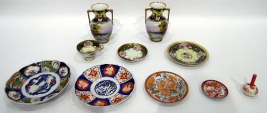 Pair of Noritake porcelain baluster-shaped vases, the yellow ground with cobalt blue and raised gilt detailing, having angular handles to body with handpainted landscape, Imari pattern pottery plates and other oriental Japanese items