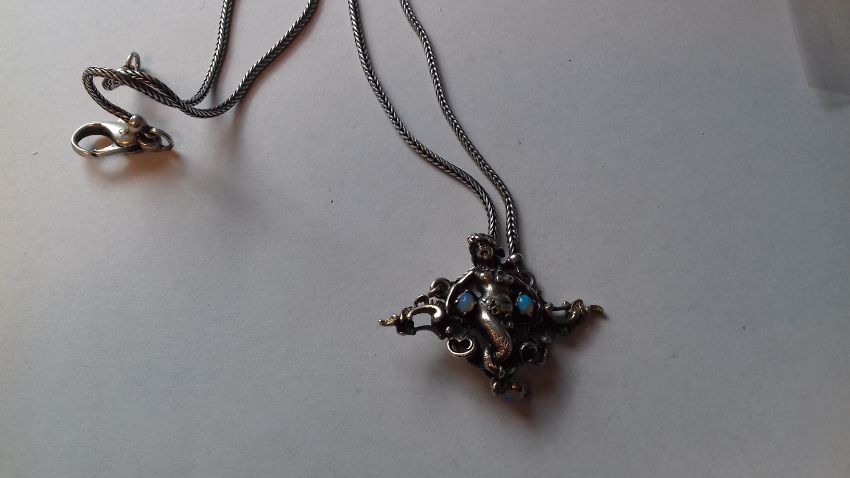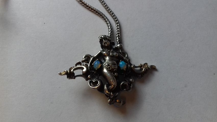 Austro-Hungarian style Art Nouveau silver and opal pendant by Schutz, in the form of central female classical nude within open scroll surround, flanked by pair opals and having circular opal pendant and the flexible chain link necklace, herringbone-pattern, marked 'K R Schutz, Austria' to reverse