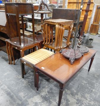 Reproduction mahogany coffee table, a dressing table stool with upholstered top, a nest of three tables, an oak sewing table of square form with hinged cover and a standard lamp (7)