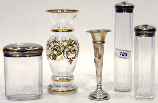 Three early 20th century silver-topped cut glass toilet jars, a silver weighted bud vase and a gilt decorated Murano glass vase (5)