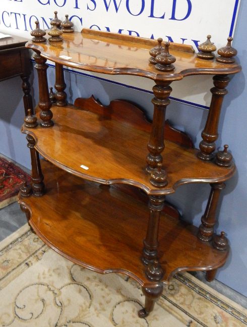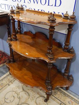 19th century carved mahogany three-tier whatnot, with turned finials, on turned legs and castors, 71cm wide