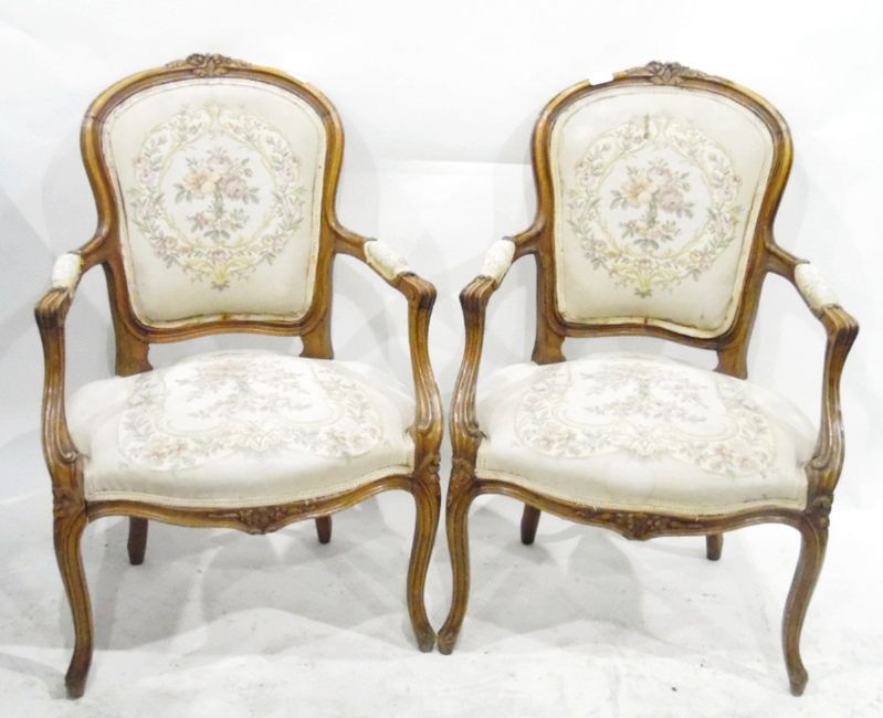 Pair of Louis XVI-style French open elbow chairs with carved cresting rails, cabriole legs, with floral upholstery (2)