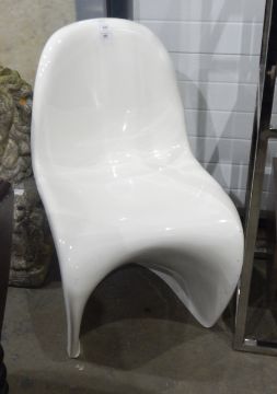 Verner Panton style white plastic moulded chair, circa 1960's/70's and four modern metal framed elbow chairs with square wooden seats and a high stool (6)