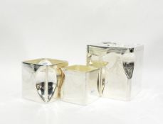 Silver condiment set in the form of three drums, inscribed 'RHB' to the lid of the mustard,