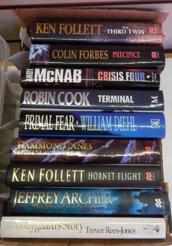 Greene, Graham "The Ministry of Fear, an Entertainment", William Heinemann 1943, rebound, full leather with gilt titles and raised bandsle Carre, John "The Night Manager", Hodder & Stoughton 1993, dj not price clipped "The Constant Gardener", Hodder & Stoughton 2001, silk ribbon marker, dj not price clipped "The Russia House", Hodder & Stoughton 1989, dj not price clipped"Absolute Friends", Hodder & Stoughton 2004, silk ribbon marker, dj not price clipped and various other modern first editions including John Grisham, Clive Cusler, Ken Follet, Robin Cook, Patricia Cornwell, etc
