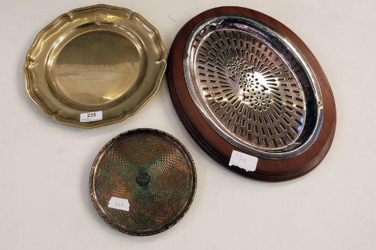 Liner interest to include a silver plated circular tray, marked 'SS Oronsay', a Mappin & Webb silver plated tray with P&O monogram and a silver plated wooden mounted stand 'The Royal Mail Steam Railway Company' (3)