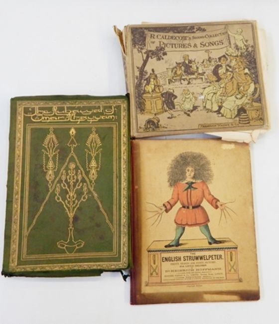 "The Rubaiyat of Omar Khayyam", ills Willie Pogany, edition limited to 525 copies, this is 486, appears to be signed by the artist, colour plates tipped in, possibly some missing, foxing, the covers green suede decorated in gilt"The English Struwwelpeter...", (n.d.), pictorial bds but bumped, worn and stained Caldicott, R D "Second Collection of Pictures and Songs", binding completely loose, loose pages, pictorial bds detached (3)
