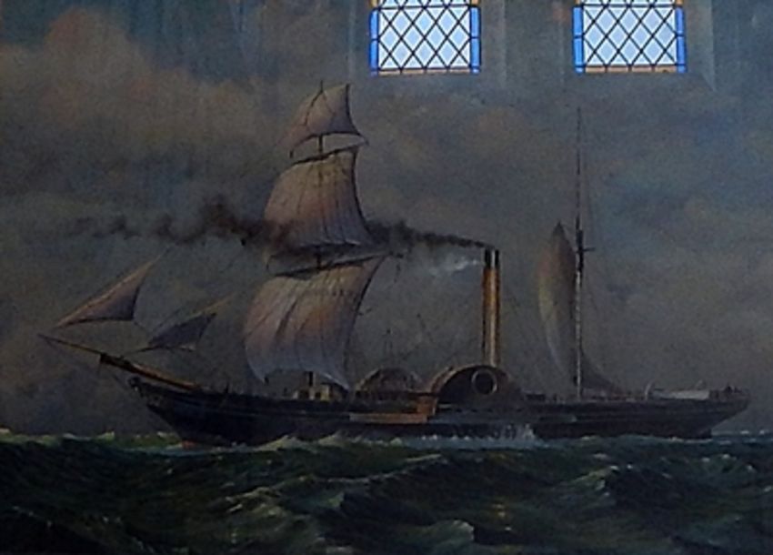 J Dunn (20th century) Oil on board "Sirius" (the first vessel to cross the Atlantic under sustained steam power built in 1837 by Menzies & Son at Leith, Edinburgh), signed lower right, 44cm x 59cm After K A Griffin Reproduction colour print "Great Britain at Sea in Heavy Weather" (2)
