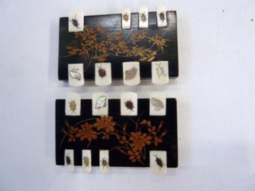 Two Japanese shibayama wood and inlaid ivory whist markers, worked with birds, insects and floral sprays