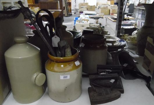 Three stoneware hot water bottles, two flat irons one marked 'Carron 5', the other marked 'Salters 7 patent', two earthenware jars, assorted fire irons, three trivets, etc