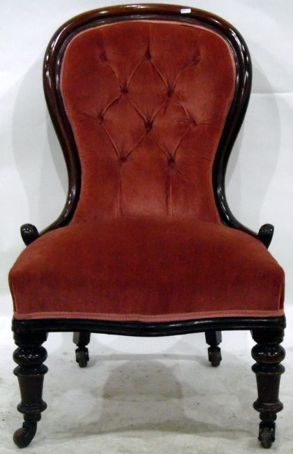 Mahogany balloonback nursing chair with button upholstery and walnut frame and a modern swivel footstool (2)