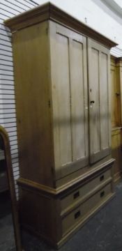 19th century stripped linen press, the pair of panelled doors enclosing trays, with two long drawers below, raised on a plinth, width 136cm